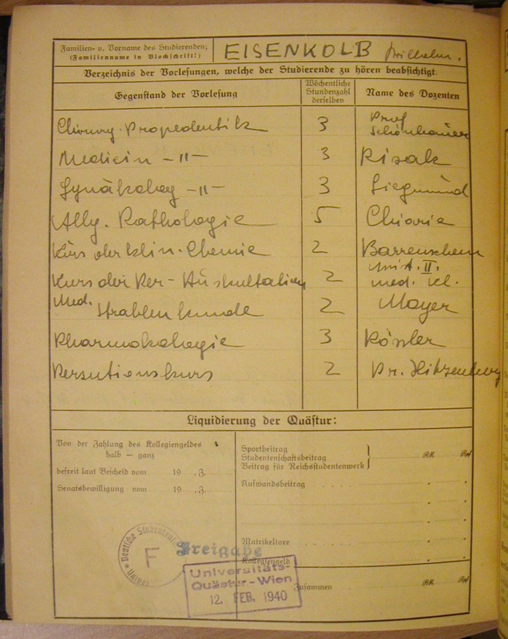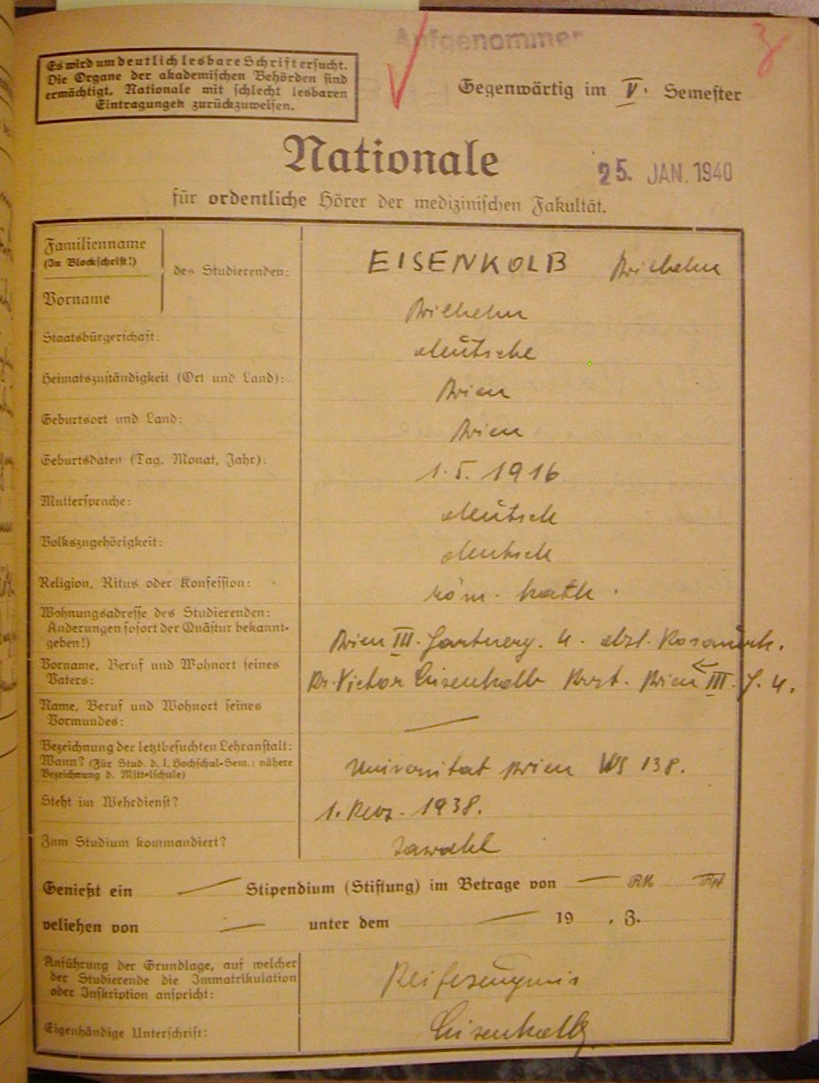 Willy (Wilhelm Viktor Ludwig) EISENKOLB, geb. am 1. Mai 1916 in Wien (heimatberechtigt in Wien, Staatsbürgerschaft: Österreich), Sohn von Med.R. Dr. Victor Eisenkolb (1873-1946, Amtsarzt der Gemeinde Wien) und Therese Eisenkolb, geb. Seidl (1893-?). Er wohnte erst in Wien 3, Gärtnergasse 4, dann in Wien 21 [heute: Wien 22], Konstanziagasse 51. Er hatte bis 1932 das Bundesgymnasium Wien 1., Stubenbastei besucht und war dann an das deutsche Internat und Mittelschule nach Laa a.d. Thaya, Niederösterreich gewechselt, wo er 1935 auch die Reifeprüfung (Matura) ablegte. Anschließend begann er an der Universität Wien Medizin zu studieren und war zuletzt im Sommersemester 1938 an der Medizinischen Fakultät im 5. Studiensemester inskribiert, nachdem er im Wintersemester 1937/38 das erste Rigorosum abgelegt hatte.